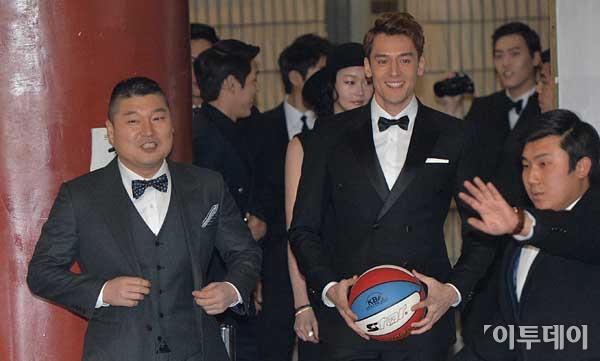 강호동(왼쪽)이 21일 오후 서울 여의도 KBS신관 TV공개홀에서 열린 KBS연예대상 시상식에 참석해 포토타임을 갖기 위해 입장하고 있다. 최유진 기자 strongman55@