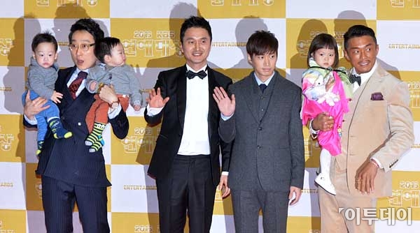 예능프로그램 '슈퍼맨이 돌아왔다'팀이 21일 오후 서울 여의도 KBS신관 TV공개홀에서 열린 KBS연예대상 시상식에 참석해 포토타임을 갖고 있다. 최유진 기자 strongman55@