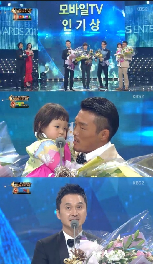 21일 밤 서울 영등포 여의도 KBS 신관공개홀에서 생방송으로 '2013 KBS 연예대상' 시상식이 열린 가운데 '슈퍼맨이 돌아왔다' 아빠들(추성훈, 이휘재, 타블로, 장현성)의 아이들이 모바일TV 인기상을 받았다.