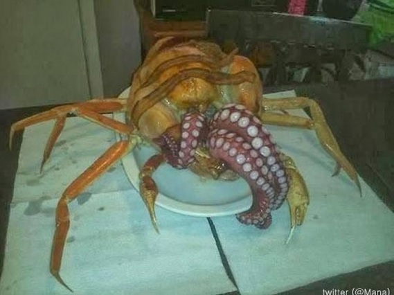 공개된 사진 속에는 닭고기와 게 다리, 문어가 한데 합쳐진 요리가 있다. 닭의 몸통에 게의 다리가 오묘하게 붙어 있는 모습이다. 게시물에 따르면 이 요리는 호주의 한 여성이 만들었다.