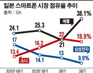 일본 시장조사업체 BCN에 따르면 지난 11월 셋째주(18~24일) 한 주간 많이 팔린 스마트폰 10위 안에 삼성전자 갤럭시는 단 한 제품도 이름을 올리지 못했다. 20위권에 든 삼성 제품도 갤럭시S4(16위)가 유일했다. 또 시장조사업체인 스트래티지애널리틱스(SA)에 따르면 지난 3분기 일본시장의 삼성전자 스마트폰 판매 점유율은 9.9%로 4위를 기록했다. 애플이 1위의 아성을 계속 이어가는 가운데, 자국 업체인 소니와 샤프가 각각 2위와 3위를 차지했다.