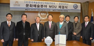 ▲한양대학교와 한예총 관계자들이 지난 20일 서울 성동구 신본관에서 양 기관간 공동사업 추진 업무협력 협약을 체결하고 기념촬영을 하고 있다.(사진=한양대)
