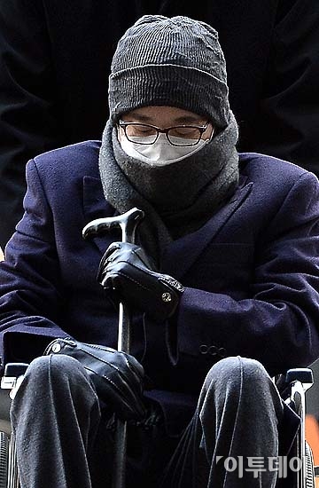 이재현 CJ그룹 회장이 23일 오전 서울 서초동 중앙지방법원에서 열린 횡령과 배임ㆍ조세 포탈 혐의에 대한 2차 공판에 휠체어를 타고 출석하고 있다. 방인권 기자 bink7119@
