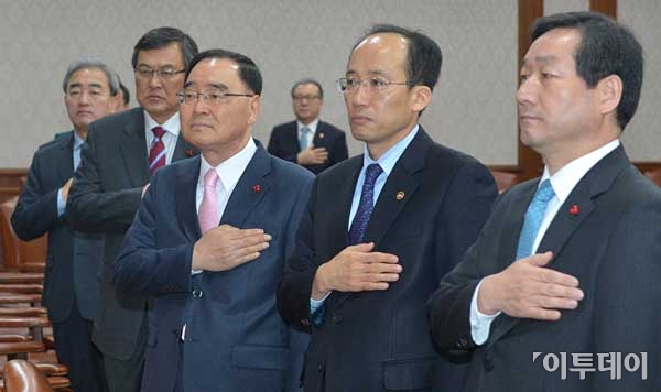 정홍원 국무총리(가운데)와 국무위원들이 24일 오전 서울 세종로 정부청사에서 열린 국무회의에 참석, 국민의례를 하고 있다. 최유진 기자 strongman55@