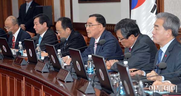 정홍원 국무총리(오른쪽에서 세번째)가 24일 오전 서울 세종로 정부청사에서 열린 국무회의에 참석, 모두발언을 하고 있다. 최유진 기자 strongman55@
