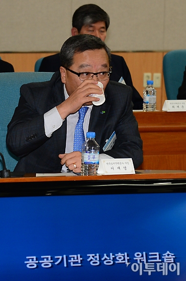 이재영 한국토지주택공사 사장이 24일 오후 경기 과천시 중앙공무원교육원에서 열린 ‘공공기관 정상화 워크숍’에 참석해 물을 마시고 있다. 이날 열린 워크숍에는 부채와 방만 경영으로 지목된 38개 중점관리 기관장과 관계부처 장관 등 60여명이 참석했다. 노진환 기자 myfixer@