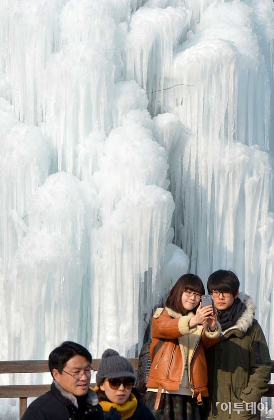 크리스마스인 25일 오전 서울 광진구 어린이대공원을 찾은 시민들이 빙벽 앞에서 사진을 찍으며 추억을 만들고 있다. 최유진 기자 strongman55@