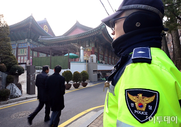 철도파업 18일째를 맞고 있는 26일 오전 박태만 철도노조 수석부위원장과 관계자들이 종로구 조계사로 피신해 있다. 조계사 주위에서 경찰들이 근무를 서고 있다. 노진환 기자 myfixer@