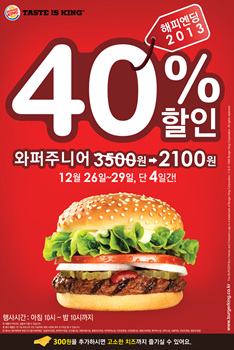 버거킹은 연말을 맞아 26일부터 오는 29일까지 나흘 동안 와퍼주니어 단품을 기존 3500원에서 40% 할인된 가격인 2100원으로 판매하는 파격 프로모션을 진행한다고 밝혔다.