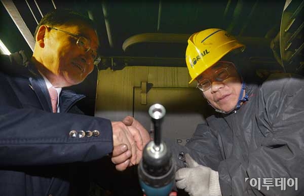 정홍원 국무총리(왼쪽)가 26일 오전 동대문구 이문동 철도차량기지를 방문, 근무중인 직원을 격려하고 있다. 최유진 기자 strongman55@