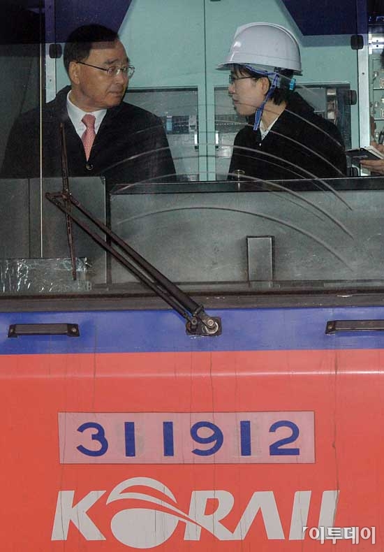 정홍원 국무총리(왼쪽)가 26일 오전 동대문구 이문동 철도차량기지를 방문, 최연혜 코레일 사장과 대화를 나누고 있다. 최유진 기자 strongman55