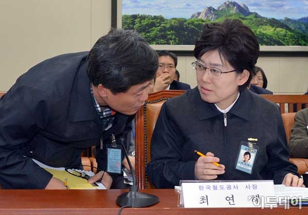 최연혜 코레일 사장(오른쪽)이 27일 오후 국회에서 열린 환경노동위원회 전체회의 도중 코레일 관계자와 대화를 나누고 있다. 이 날 회의에는 국토교통부와 고용노동부 장관, 코레일 사장, 철도노조 관계자 등이 참석했다. 최유진 기자 strongman55@