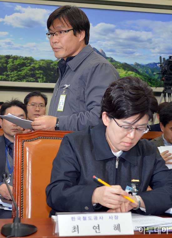 전국철도노동조합 김재길 정책실장이 27일 오후 국회에서 열린 환경노동위원회 전체회의에 참석해 발언을 하러 나가고 있다. 최연혜 코레일 사장은 메모를 하고 있다. 이 날 회의에는 국토교통부와 고용노동부 장관, 코레일 사장, 철도노조 관계자 등이 참석했다. 최유진 기자 strongman55@
