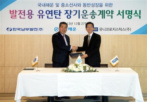 한진해운은 이날 여의도 사옥에서 이상호 한국 남부발전 사장과 석태수 한진해운 사장 등 관련 임직원들이 참석한 가운데 케이프급 선박 2척에 대한 10년, 15년 유연탄 장기 운송 계약 체결식을 진행했다.