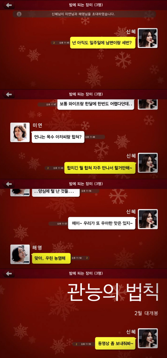 엄정화, 문소리, 조민수 등이 주연을 맡아 40대 여성의 현실적 공감과 판타지를 그려낸 영화 ‘관능의 법칙’(제작 명필름, 배급 롯데엔터테인먼트, 감독 권칠인)이 2014년 2월 개봉을 확정 짓고, 세 여배우의 솔직 대담한 카카오톡 대화를 담아낸 티저 예고편을 공개했다.