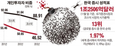 30일 한국거래소에 따르면 올 들어 지난 27일까지 유가증권시장의 개인투자자 거래대금 비중은 46.52%다. 코스닥시장 비중은 88.91%다. 이는 연간 개인투자자 비중이 공식 집계된 2002년 이후 11년 만에 가장 낮은 수준이다.