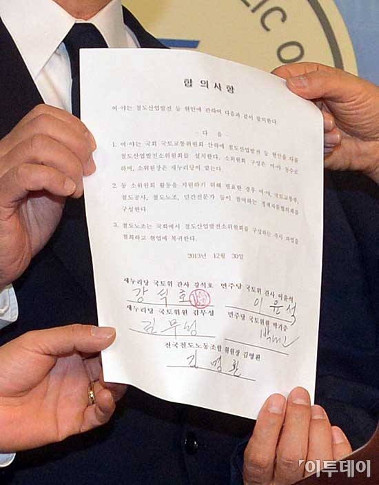 국회 국토교통위 여·야 의원들이 30일 오전 국회 정론관에서 철도발전소위원회 구성 합의 결과를 발표한 뒤 합의문을 들어보이고 있다. 최유진 기자 strongman55@