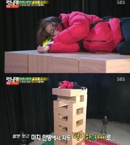 배우 송지효가 7m 높이의 ‘대형젠가’ 위에서 꿀잠을 자는 모습이 방송돼 화제다.