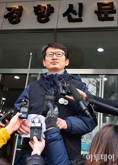 철도노조가 국회에 철도발전소위원회를 구성하는 조건으로 파업을 철회하기로 합의한 30일 오후 서울 정동 민주노총 서울본부 앞에서 백성곤 철도노조 홍보팀장이 향후 계획에 대하여 브리핑을 하고 있다. 방인권 기자 bink7119@