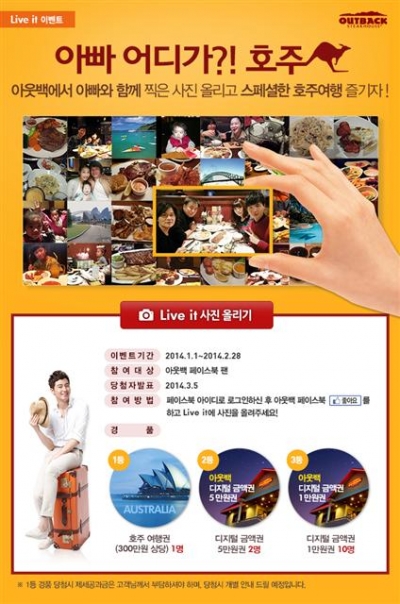 아웃백 스테이크하우스는 3만원 이상 주문하는 고객 중 추첨을 통해 1등 1명에게 300만원 상당의 호주 여행권을, 2명에게 매장에서 현금처럼 사용가능한 디지털 금액권 5만원권, 10명에게 디지털 금액권 1만원권을 각각 증정한다.