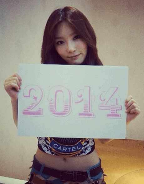 공개된 사진 속 태연은 탄탄한 복근이 보이는 짧은 상의를 입은 채 2014라는 숫자가 적힌 종이를 들고 카메라를 응시하고 있다.