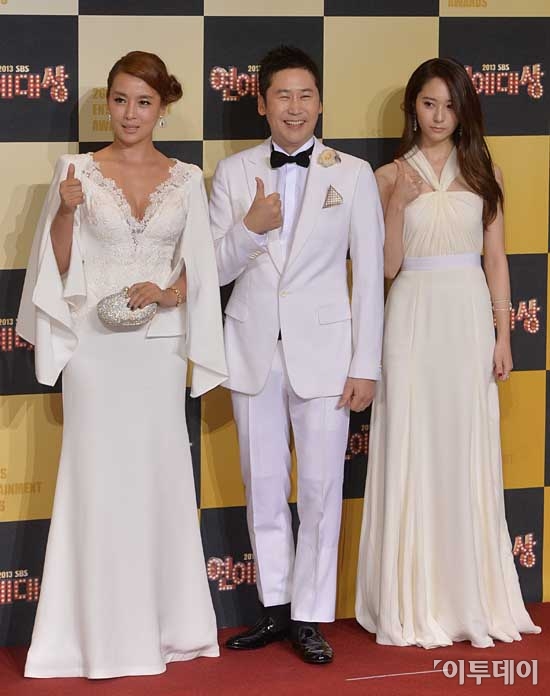▲배우 김원희, 개그맨 신동엽, 에프엑스 멤버 크리스탈(왼쪽부터)이 30일 오후 서울 상암동 SBS프리즘타워에서 열린 '2013 SBS연예대상'에 참석해 포토타임을 갖고 있다.(사진 = 최유진 기자 strongman55@)