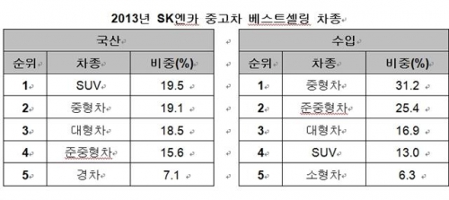 정인국 SK엔카 종합기획본부 본부장은 “최근 실속형 소비 성향이 확산되면서 차량 구매 목적에 맞게 SUV나 준중형차를 찾는 소비자들이 늘고 있다”고 말했다.