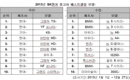 SK엔카는 올 한해 SK엔카 홈페이지에 등록된 중고차 매물을 집계한 결과 국산은 현대 그랜저 TG, 수입은 BMW 뉴 5시리즈가 각각 2013년 베스트셀링 모델로 선정됐다고 31일 밝혔다.