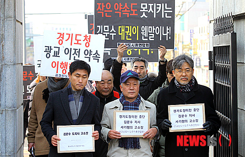 경기도 광교신도시 입주민들은 31일 도청사 광교 이전사업 지연에 대해 김문수 지사를 직무유기ㆍ직권남용권리행사방해ㆍ사기 혐의로 수원지검에 고소했다. 광교신도시 단지별 입주자대표와 동대표 151명이 공동고소인으로 참여했다.