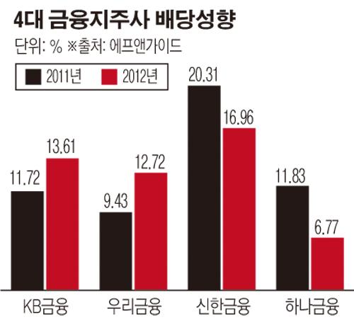 수익이 반토막나며 어닝쇼크를 기록했던 지난 2012년 금융지주의 배당성향(당기순이익에 대한 현금배당액 비율)은 2011년과 비교해 크게 떨어졌다. 신한금융과 하나금융의 배당성향은 2011년 20.31%, 11.83%에서 각각 16.96%, 6.77%로 대폭 줄어 들었다.
