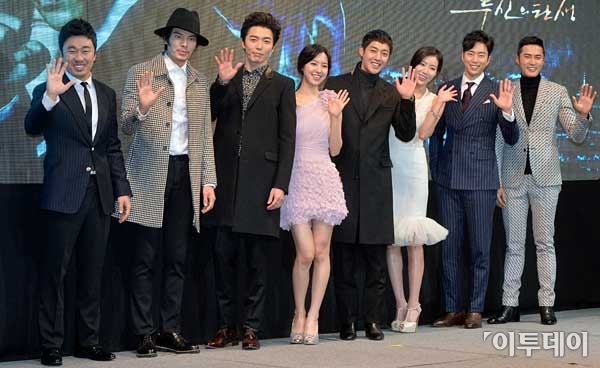 배우 조달환, 김성오, 김재욱, 진세연, 김현중, 임수향, 윤현민, 조동혁(왼쪽부터)이 9일 오후 서울 강남구 논현동 임페리얼 팰리스에서 열린 KBS 2TV드라마 '감격시대:투신의 탄생' 제작발표회에 참석해 포토타임을 갖고 있다. '감격시대:투신의 탄생'은 한·중·일 3국의 낭만주먹들이 펼쳐내는 사랑과 의리, 우정과 판타지를 보여줄 감성로맨틱 느와르로 오는 15일 밤 10시에 첫 방송된다. 최유진 기자 strongman55@