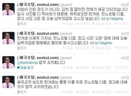 변희재 대표는 9일 자신의 트위터를 통해 "서빙이 안된 정도가 아니라 김치 등 밑반찬 전체가 제공 안되었다. 당시 사진을 다 찍어놨기 때문에 허위보도한 언론, 친노포털, 식당 사장 등 오늘 남부지검에 고소장 넣는다"며 강경한 입장을 드러냈다.