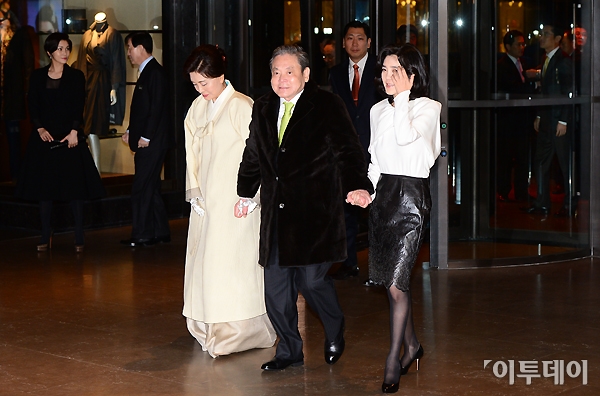73세 생일을 맞은 이건희 삼성전자 회장이 9일 오후 서울 중구 신라호텔에서 열린 삼성그룹 사장단 신년 만찬에 부인 홍라희 리움미술관 관장과 딸 이부진 호텔신라 사장과 함께 참석하고 있다. 노진환 기자 myfixer@