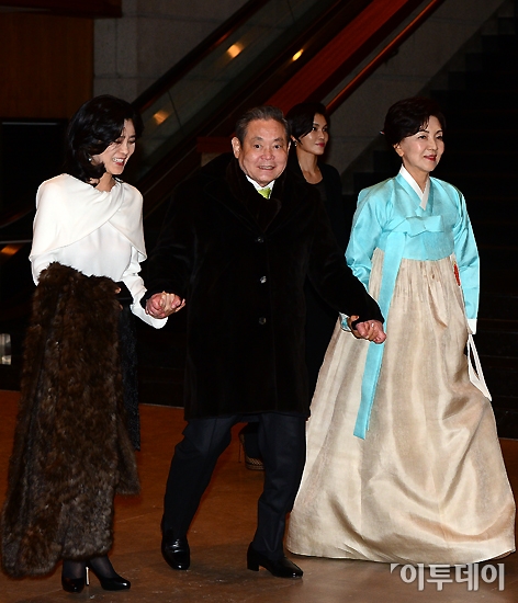 73세 생일을 맞은 이건희 삼성전자 회장이 9일 오후 서울 중구 신라호텔에서 열린 삼성그룹 사장단 신년 만찬을 마치고 부인 홍라희 리움미술관 관장과 딸 이부진 호텔신라 사장, 이서현 삼성에버랜드 패션부문 사장과 함께 호텔을 나서고 있다. 노진환 기자 myfixer@
