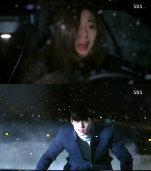 다행이 절벽아래로 떨어지려고 하는 천송이의 차를 멈춰 세워 목숨을 건졌다. 천송이는 그런 도민준의 모습을 목격했다.