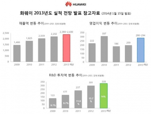 아울러 화웨이의 2013년 영업이익은 최소 4조 9789억에서 최대 5조1182억원으로 전년 대비 약 43% 늘었다.