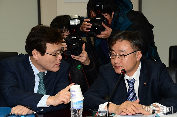 정찬우 금융위원회 부위원장(오른쪽)과 최종구 금융감독원 수석부원장이 17일 오후 서울 중구 금융위원회 대회의실에서 열린 금융회사 고객정보보호 정상화 TF 첫 회의에 참석해 이야기를 나누고 있다. 노진환 기자 myfixer@