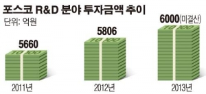 포스코의 R&D 투자는 꾸준히 증가해 세계 철강사 중 상위 수준인 1.5%(매출액 기준)를 유지하고 있다. 2012년에는 5800억원을 투자하며 당초 계획 대비 200억원을 추가 집행했으며 지난해에는 6000여억원을 집행했다.