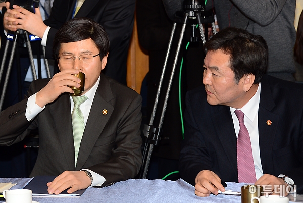 카드사 개인정보 유출사고 종합방지 대책 당정협의가 22일 오전 여의도 국회 귀빈식당에서 열렸다. 황교안 법무부 장관(왼쪽)과 신제윤 금융위원장이 회의가 시작하기 전 이야기를 나누고 있다. 이날 열린 당정협의에서는 카드사 개인정보유출 사고 관련 피해예방 및 재발방지대책을 논의할 예정이다. 노진환 기자 myfixer@