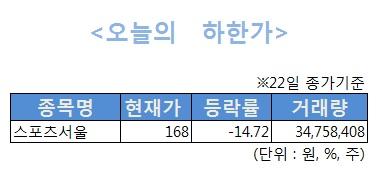22일 국내 주식시장에서는 코스닥시장에서 스포츠서울만이 하한가로 장을 마감했다.