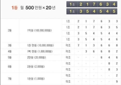 한국연합복권은 22일 추첨한 '연금복권520' 1등 당첨번호가 '1조217634'와 '1조354545'라고 밝혔다.