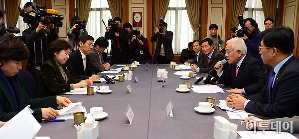 김한길 민주당 대표가 23일 오전 여의도 국회 귀빈식당에서 열린 ‘제1차 민주당 AI 상황 점검 및 대책 간담회’에 참석해 인사말을 하고 있다. 노진환 기자 myfixer@