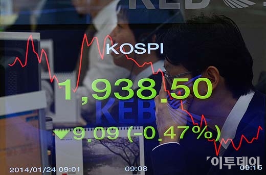 코스피가 약보합 출발하며 이틀째 약세 흐름을 보이고 있다. 24일 오전 코스피지수는 전거래일대비 9.09포인트(-0.47%) 하락한 1,938.50을 기록 중이다. 사진은 이날 외환은행 딜링룸. 방인권 기자 bink7119@