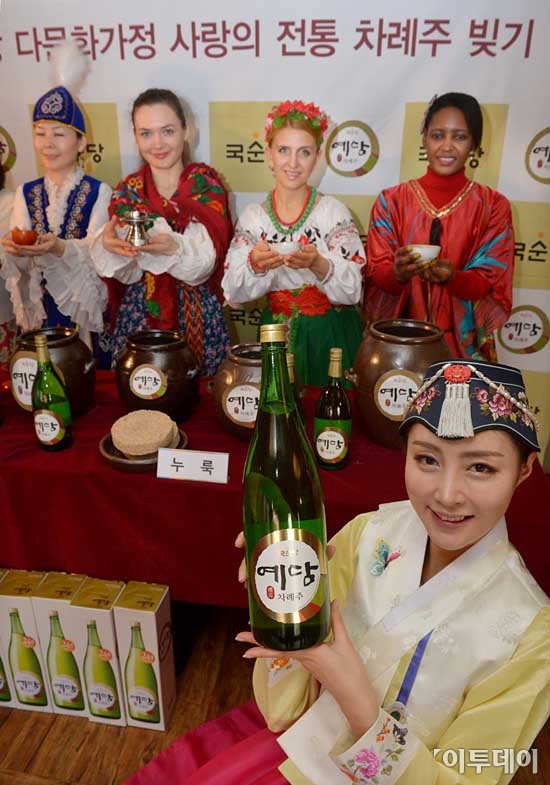 전통주 전문기업 국순당은 26일 오전 서울 종로구 관철동 백세주마을 종각점에서 설을 맞이해 다문화 부부 초청, 전통 차례주 빚기 체험행사를 가졌다. 이 날 참석한 다문화 가족들이 전통복장을 입고 차례주를 들어보이고 있다. 최유진 기자 strongman55@