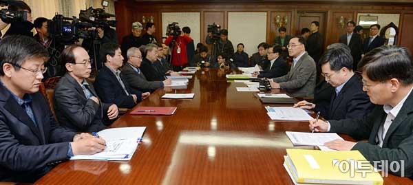 정홍원 국무총리(오른쪽에서 세번째)가 26일 오후 서울 종로구 세종로 정부서울청사 총리 집무실에서 AI확산 대책논의를 위한 긴급장관회의를 주재하고 있다. 이날 회의에는 현오석 경제부총리 겸 기획재정부 장관과 이동필 농림축산식품부 장관, 김관진 국방부 장관이 참석했으며 AI 확산과 더불어 카드사 개인정보 유통 차단 방안도 논의됐다. 최유진 기자 strongman55@