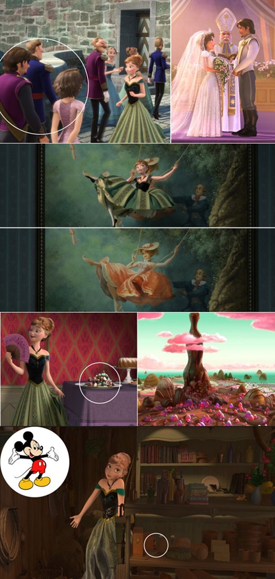 극중 엘사의 여왕 대관식이 열리는 날, 동생 안나가 즐겁게 성문 밖을 나서는 장면에서 디즈니 애니메이션 '라푼젤'의 주인공 라푼젤과 유진이 하객으로 참석하는 것.