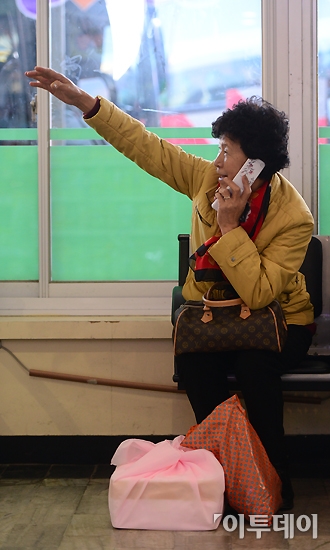 민족 최대의 명절 설을 앞두고 있는 28일 오후 서울 서초구 반포동 고속버스터미널에서 역귀성한 어르신이 마중 나온 아들을 찾고 반갑게 손을 흔들고 있다. 노진환 기자 myfixer@