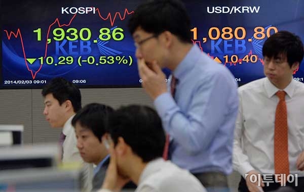 미국 연방공개시장위원회(FOMC)가 지난 달 말 양적완화 규모를 100억달러 추가로 줄이면서 금융시장 위기감이 확산되고 있다. 3일 서울 오전 서울 중구 외환은행 딜링룸 전광판의 코스피 지수가 하락 출발하고 있다. 최유진 기자 strongman55@