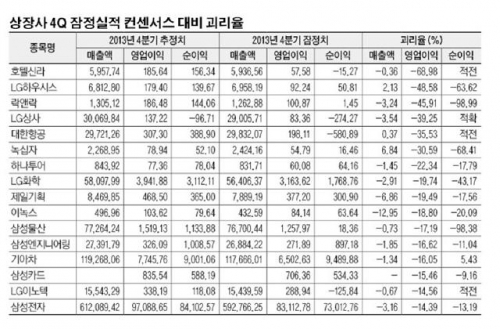 6일 에프앤가이드에 따르면 지난 4기 영업이익 추정치와 확정치 간 비교가 가능한 53개 종목 가운데 괴리율이 10% 이상인 종목이 20개로 나타났다. 통상적으로 전망치보다 10% 이상 낮은 실적이 나오면 어닝쇼크로 판단한다.
