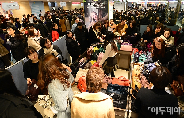 롯데백화점 본점에서 6일 오전 ‘해외명품 대전’이 열려 고객들이 제품을 고르고 있다. 이번 행사는 9일까지 에트로, 멀버리, 아르마니 등 120여개 브랜드가 참여해 600억 규모의 물량이 선보인다. 노진환 기자 myfixer@